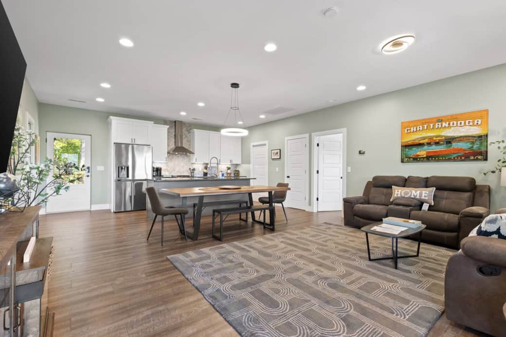 PHOTOS FROM COMPLETED HOME NEXT DOOR. Discover your perfect getaway in this newly built, secluded cabin, just completed in 2025! Nestled near the heart of Chattanooga and just across the state line, this modern home offers a serene retreat with breathtaking mountain views from every porch. Delightfully positioned under a canopy of trees. Situated beside Lookout Mountain, it’s an ideal spot for family gatherings, combining tranquility with proximity to local attractions. 🌲🏡🏔️🔔 PLEASE NOTE: THIS IS THE TOP FLOOR UNIT IN A MULTI-UNIT HOME 🔔 This is the first floor in the home to be complete in the new house, updated photos to follow. Dining room table is expected 11/24. It is not guaranteed to be in place that week hence the discount. If the dining room table does not come on 11/24 and you book during Thanksgiving, we can always move the patio table inside. Everything else in the home will be ready for guests!